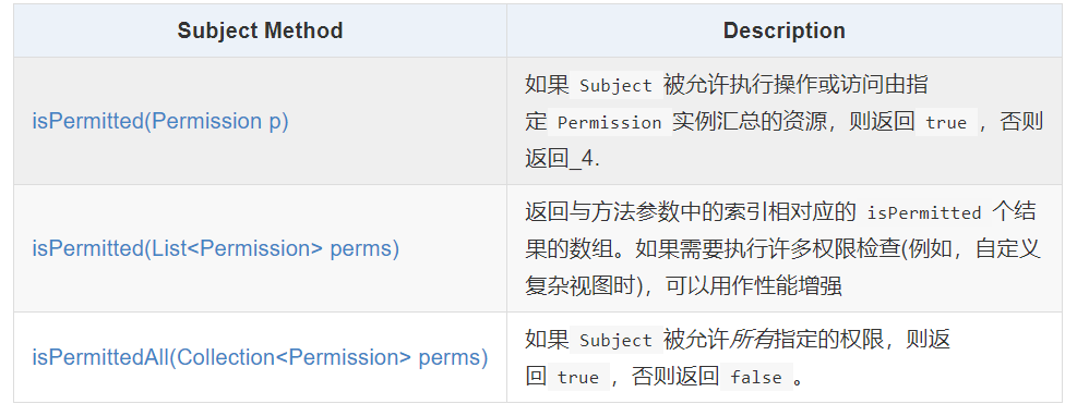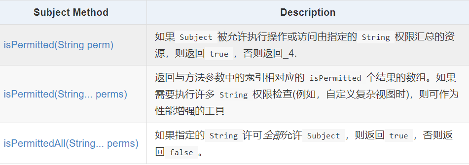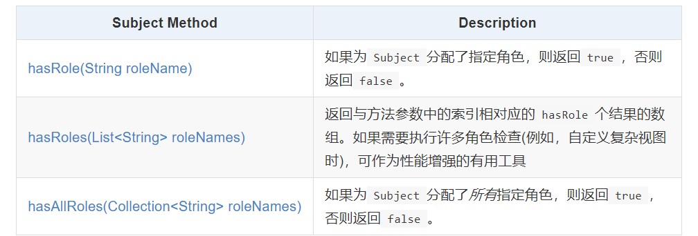 - 授权器逐个使用所有领域,直到找到 Subject 指定角色。如果都没有则返回 false
