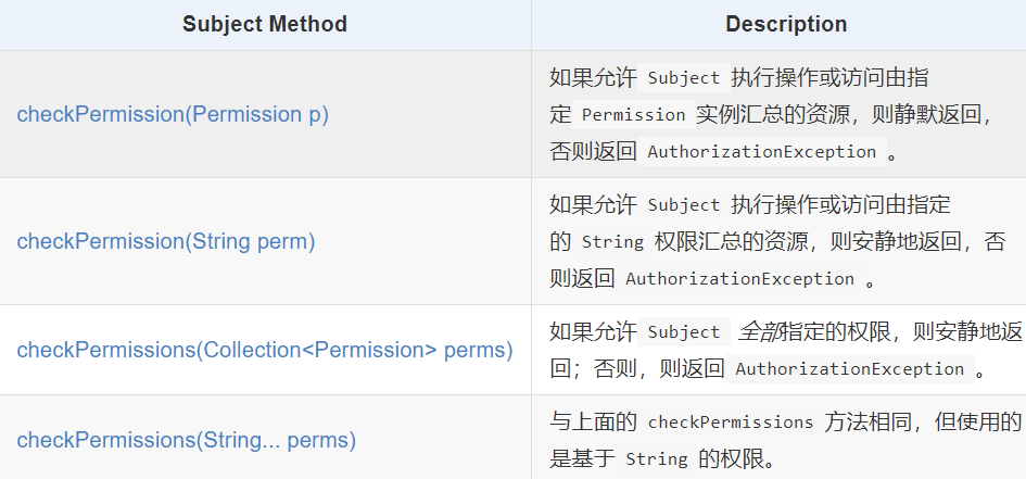 - 授权器逐个使用所有领域,直到找到 Subject 指定角色。如果都没有则返回 false